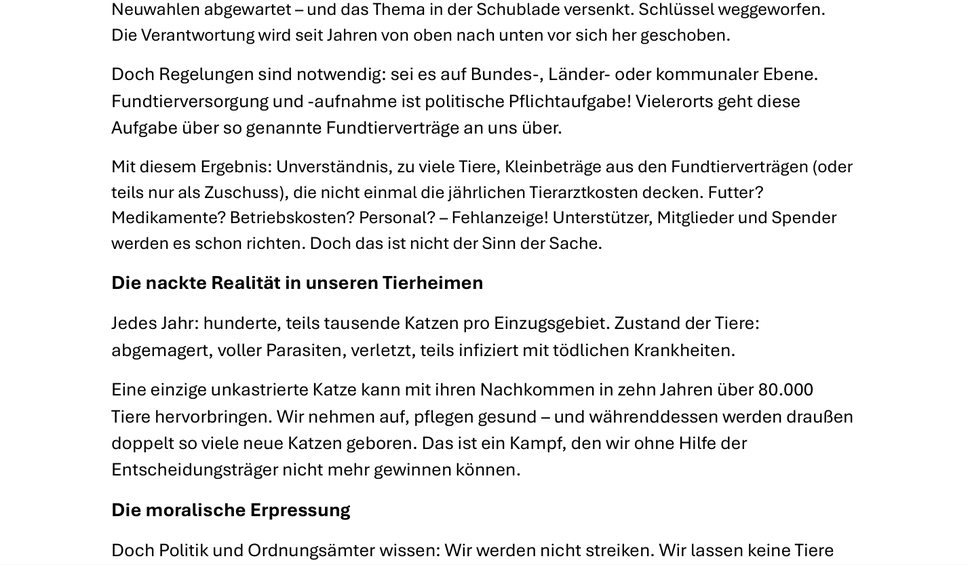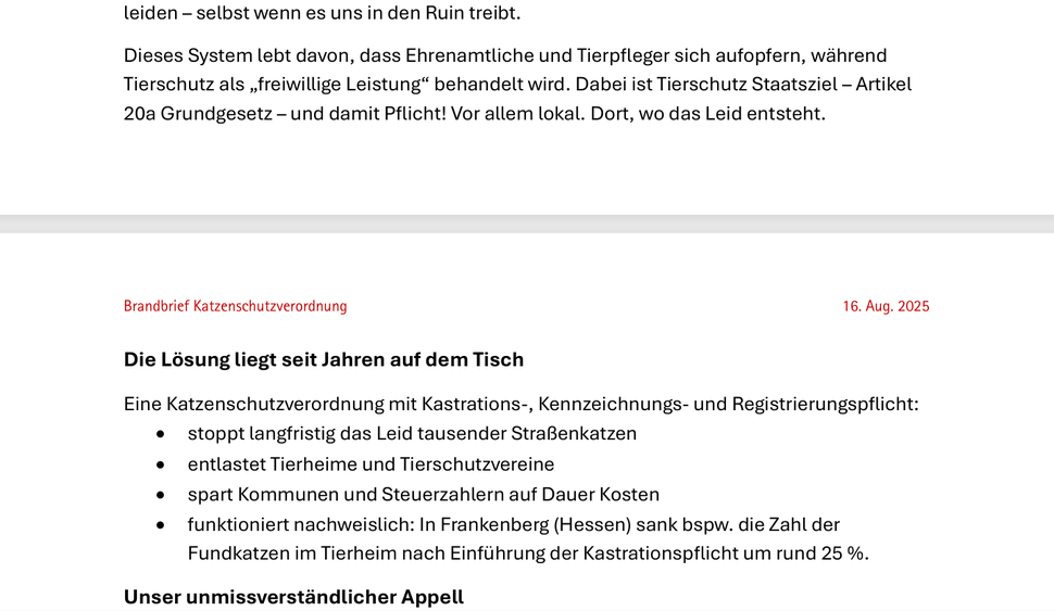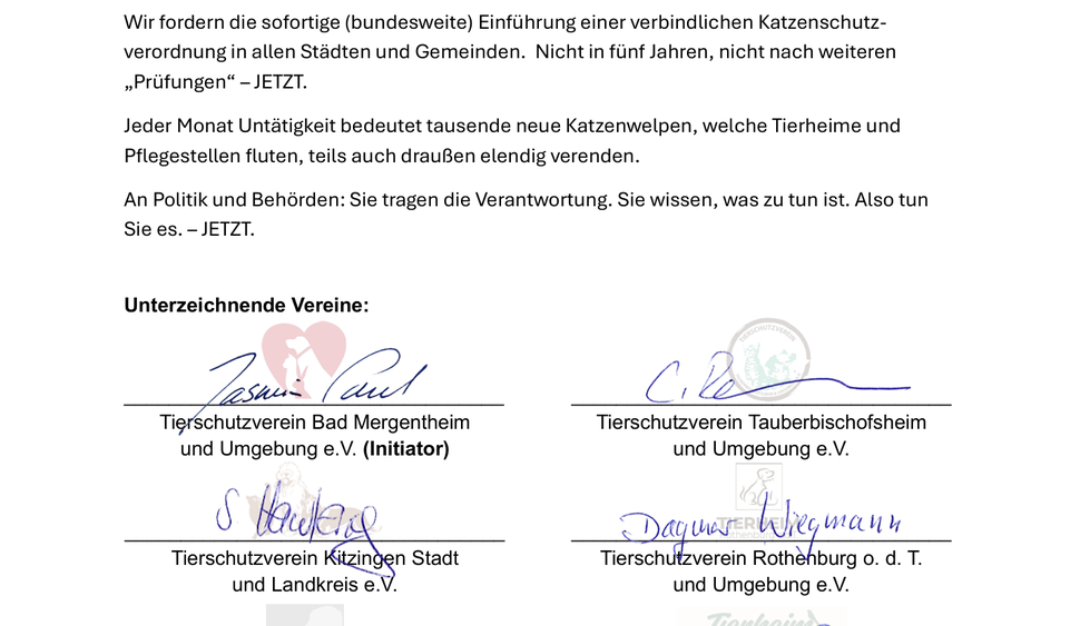 Als gemeinsames Signal haben zehn Vereine einen Brandbrief an die Politik – lokal wie überregional – verfasst. Auch Vereine, die bereits eine Katzenschutzverordnung haben, erklärten vor Ort ihre Solidarität und sicherten Unterstützung zu."