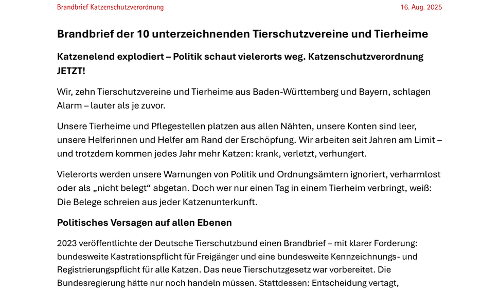 Quelle: Brandbrief Katzenschutzverordnung - Tierschutzverein Bad Mergentheim