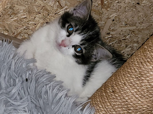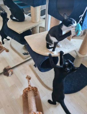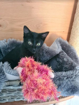 Es sind Alles muntere Mädels und ein frecher schwarzer kleiner Kater, der seinem Namen alle Ehre erweist. Sie sind sehr verschmust und verspielt. Wenn du morgens das Zimmer betrittst, ertönt ein lautes Schnurrkonzert. Sie sind 14 Wochen jung und hatten es zu Beginn ihres Lebens nicht leicht. Sie kamen völlig unterernährt bei uns an. Aber das ist jetzt Geschichte, sie haben gefressen wie die kleinen Bären und haben Alles aufgeholt. Sie sind sehr sozial und eignen sich auch für Familien mit Kindern.